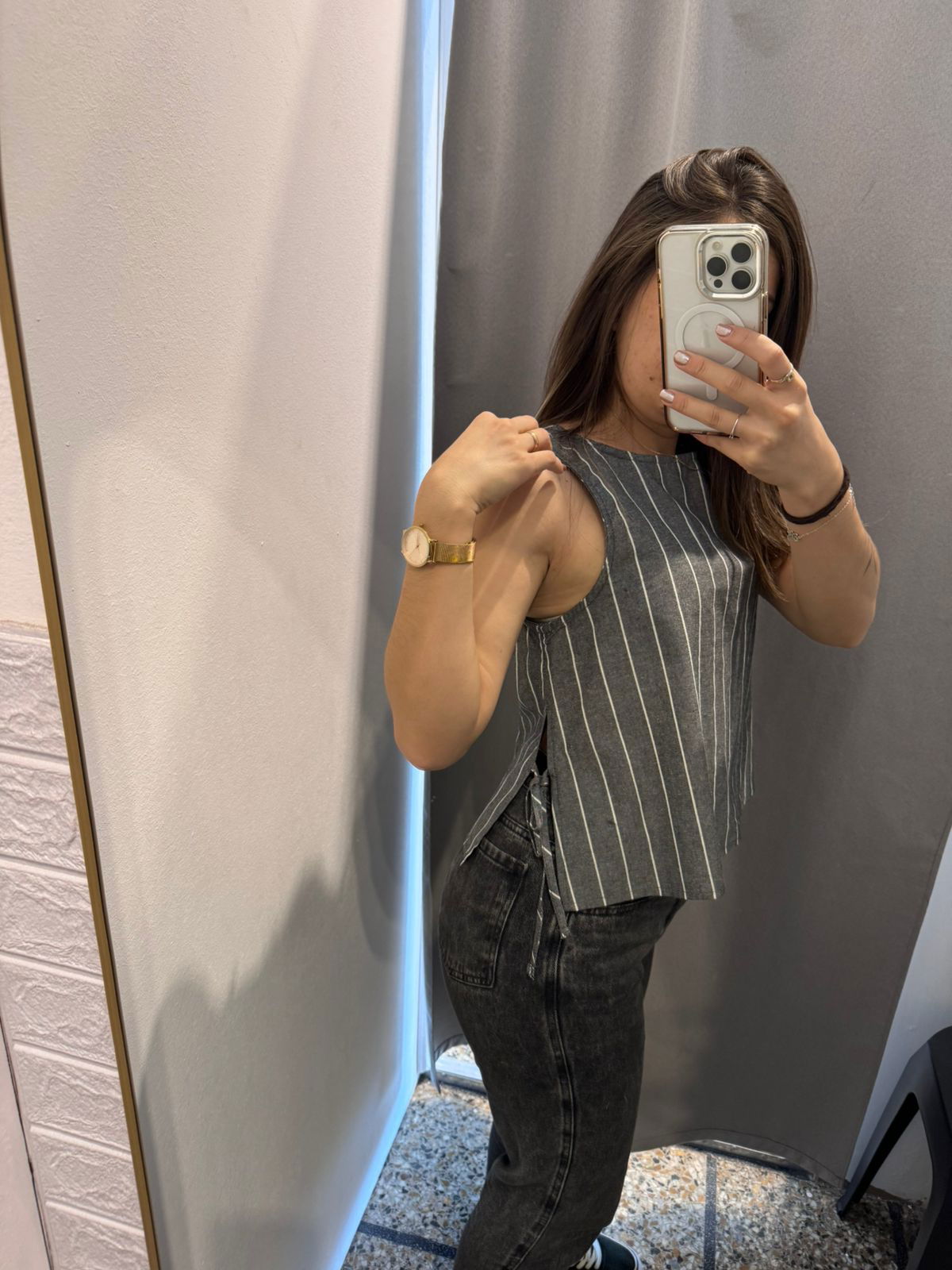 Una blusa súper delicada de algodón con poliéster con un hermoso estampado rayado y un tirante en la parte inferior de cada lado para atar