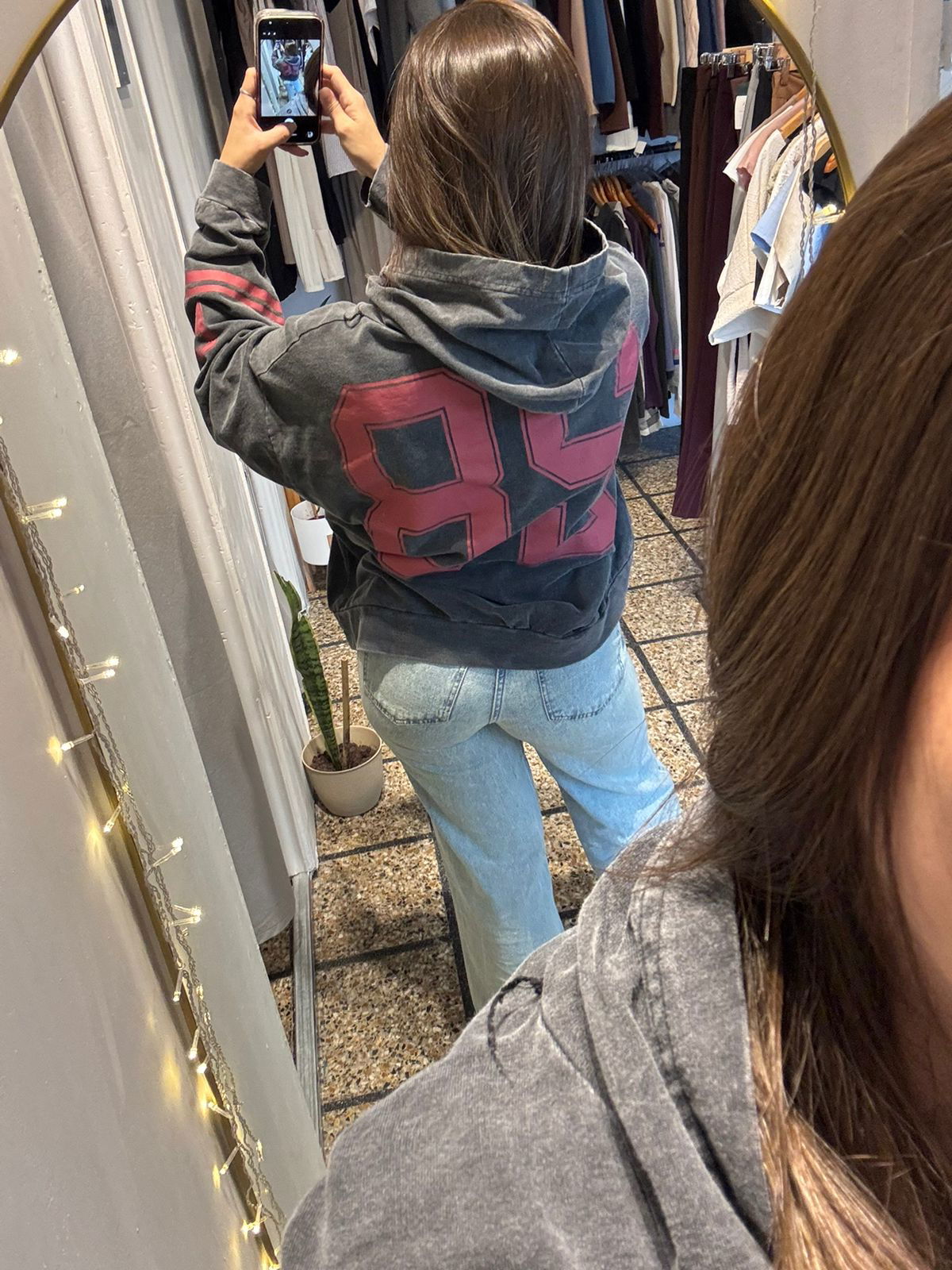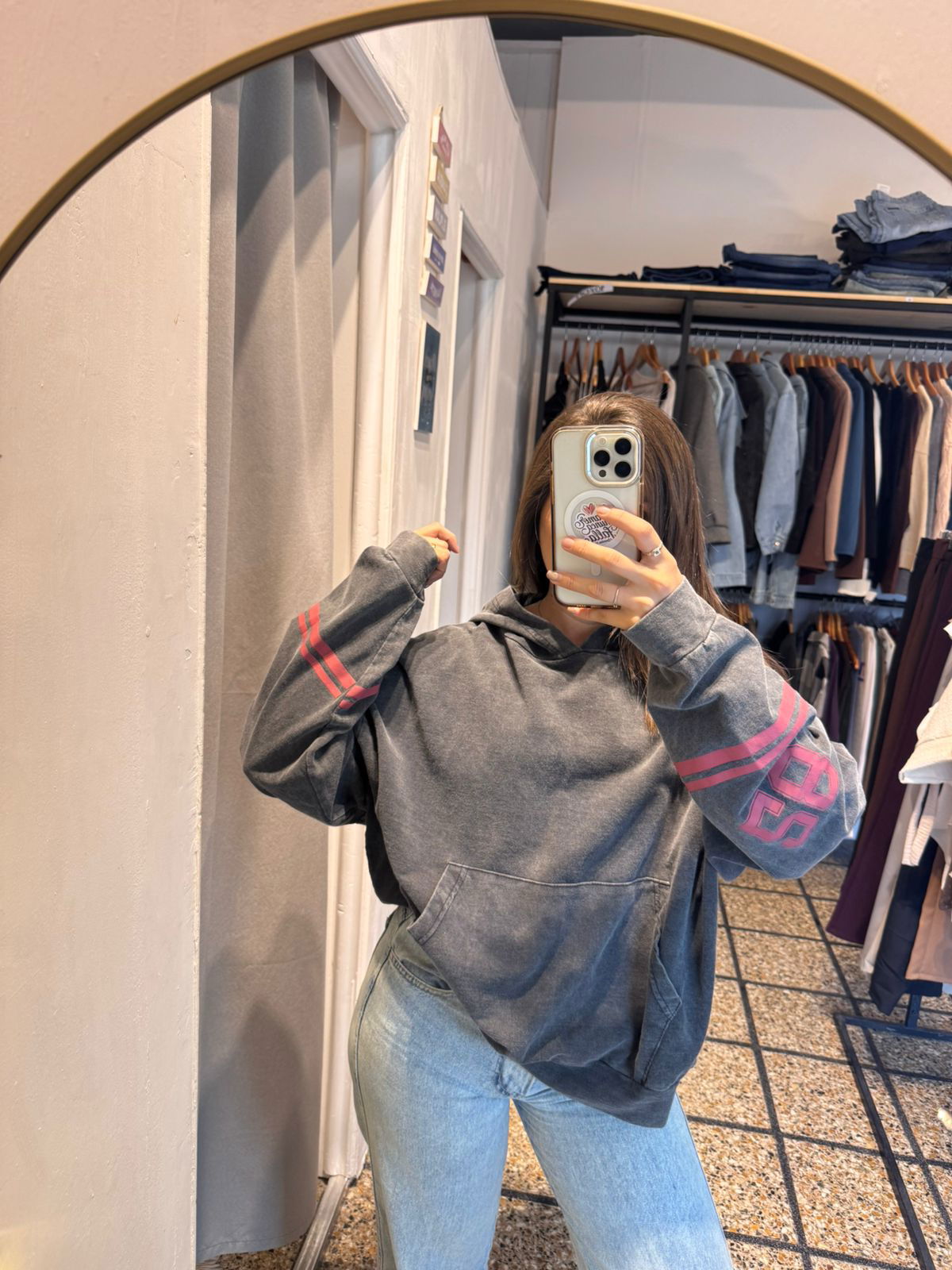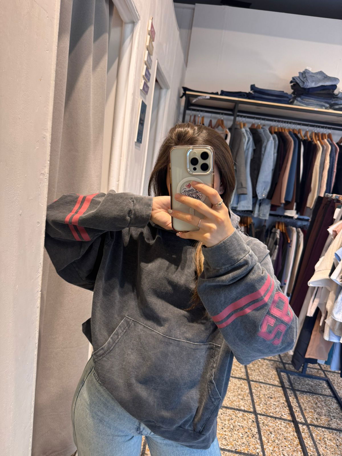 Estampa en la espalda y en las mangas, capucha y bolsillo canguro