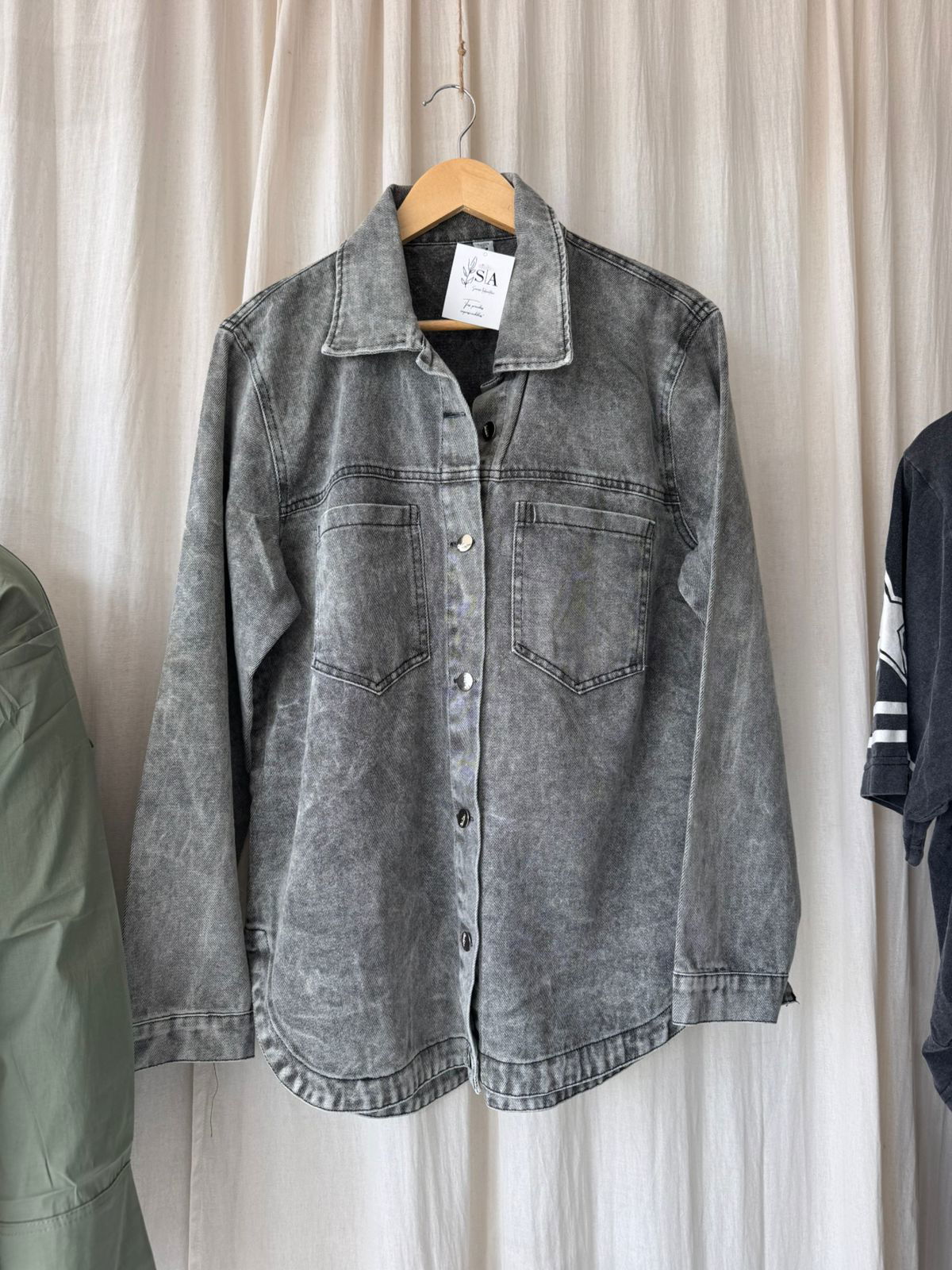 Tiene un calce oversize, ideal para usar suelta y cómoda, con caída liviana que estiliza sin marcar. Los bolsillos delanteros y los botones metálicos le suman ese toque clásico que nunca falla.