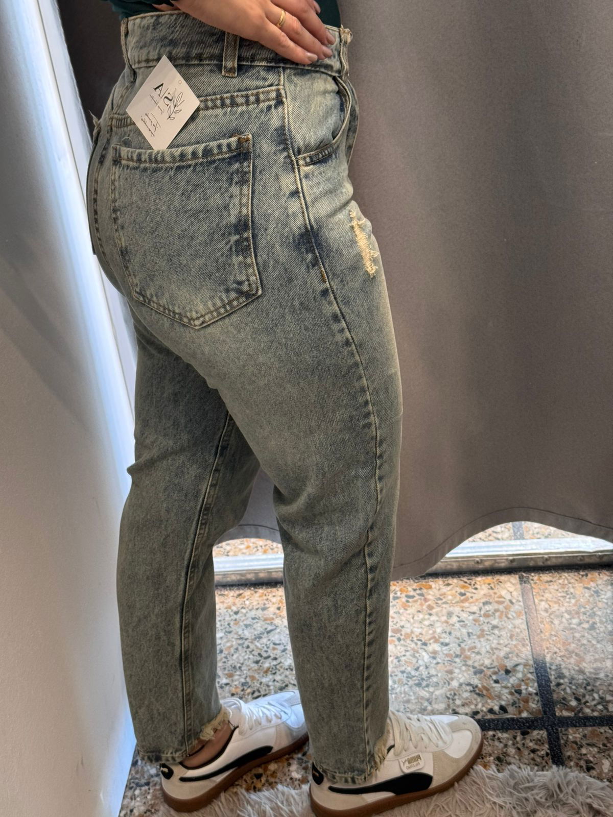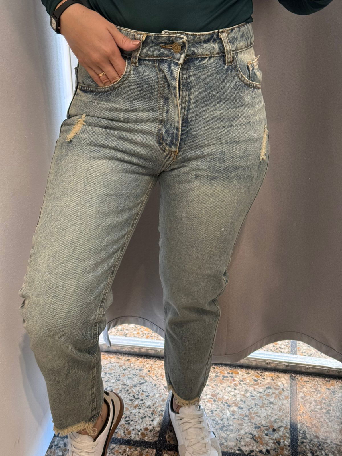 con bolsillos y pasacinto, pequeñas roturas en la parte frontal y desflecado en la parte de adelante del talón