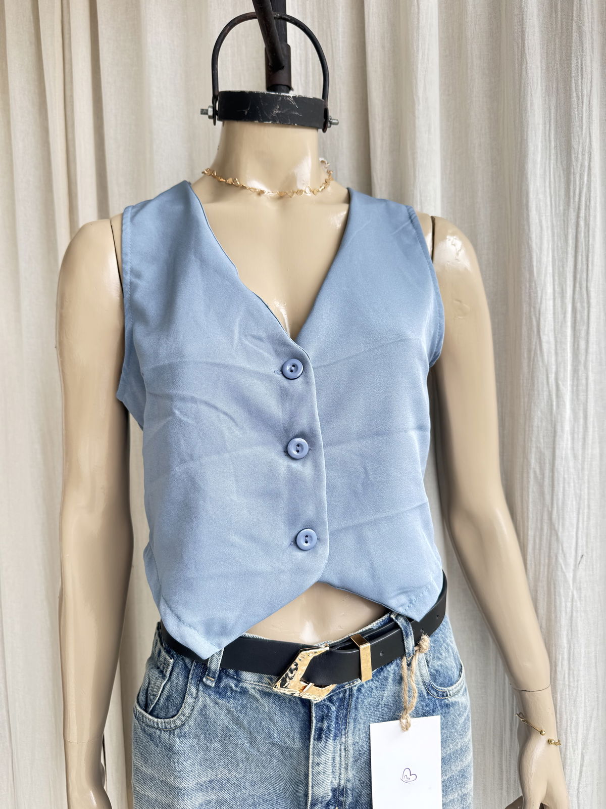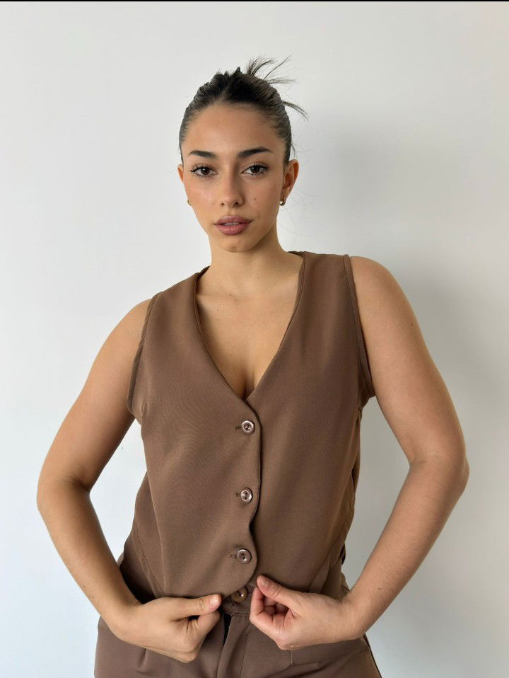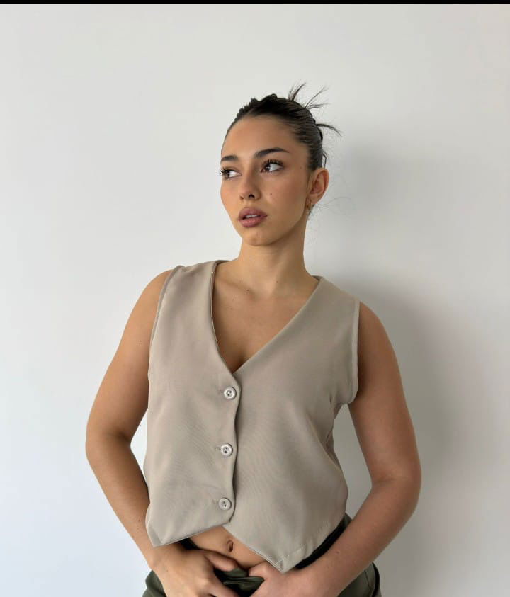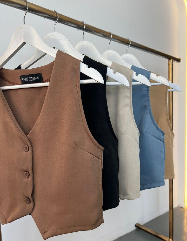 Chaleco Sastrero Corto – Un básico canchero que eleva cualquier look. Confeccionado en corte sastrero, tiene botones frontales a tono que le dan un toque elegante y versátil. Su diseño corto lo convierte en la prenda ideal para usar solo, sobre una remera o combinado con blazer y pantalón. Perfecto para looks casuales con estilo o para un outfit más sofisticado.